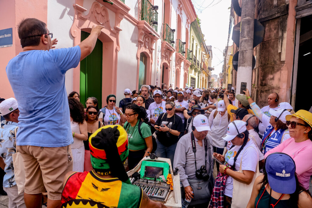 En la primera parte del día, los participantes recorrieron el centro histórico de Belém, guiados por el profesor e historiador Michel Pinho, investigador de la historia social de la ciudad. El recorrido se estructuró como una conferencia pública, con reflexiones sobre el papel de las poblaciones negras, indígenas y ribereñas en la formación de Pará y sobre las luchas de resistencia que marcaron la región, como el Cabanagem, una revuelta popular que tuvo lugar entre 1835 y 1840 contra la explotación y el autoritarismo de las élites coloniales.